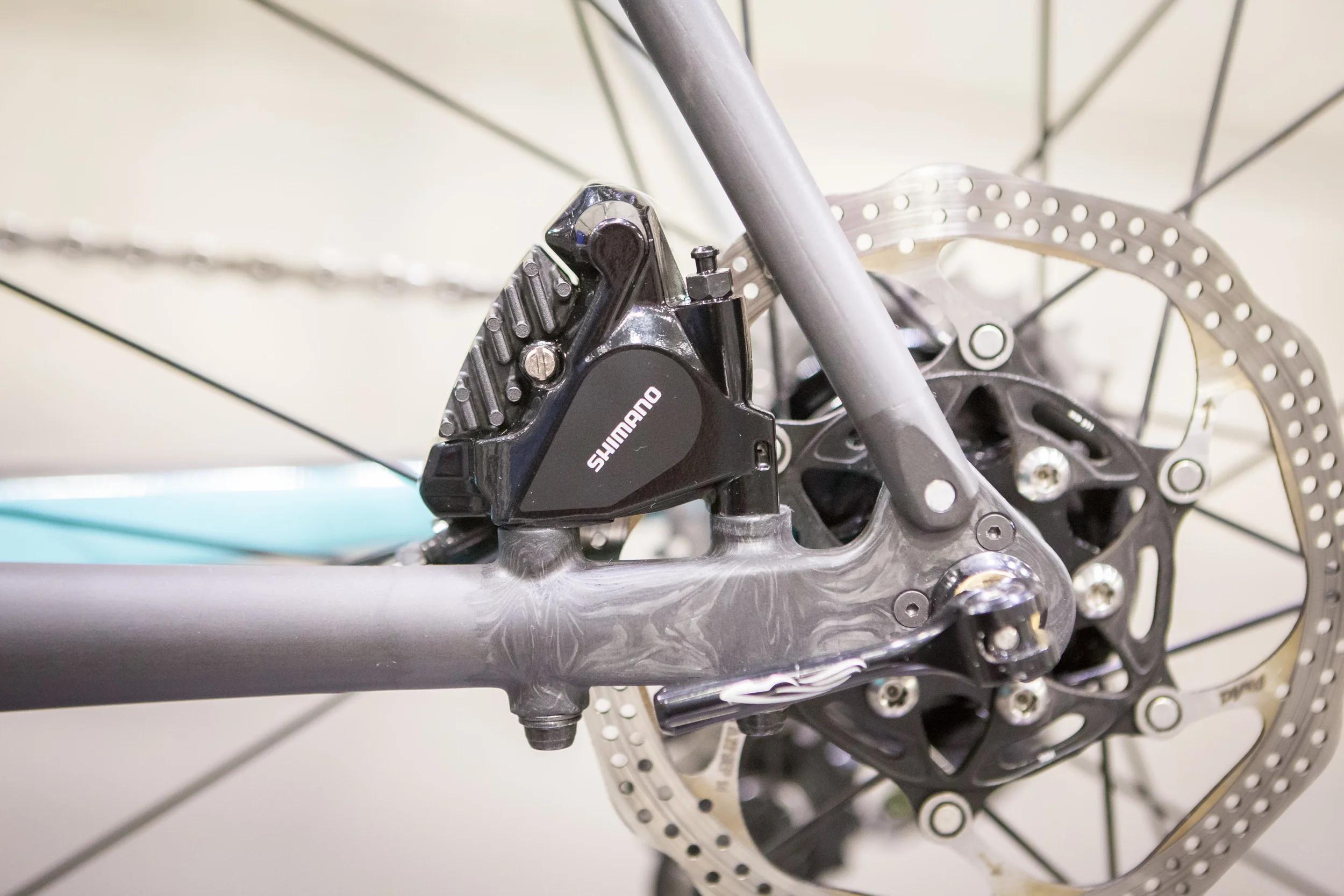 Now available in disc or caliper brakes, Ben is showing off his new direct mount rear end when you opt for disc version. Slimmed down, it now looks like a road setup rather than displacing a mountain bike caliper on a road frame.