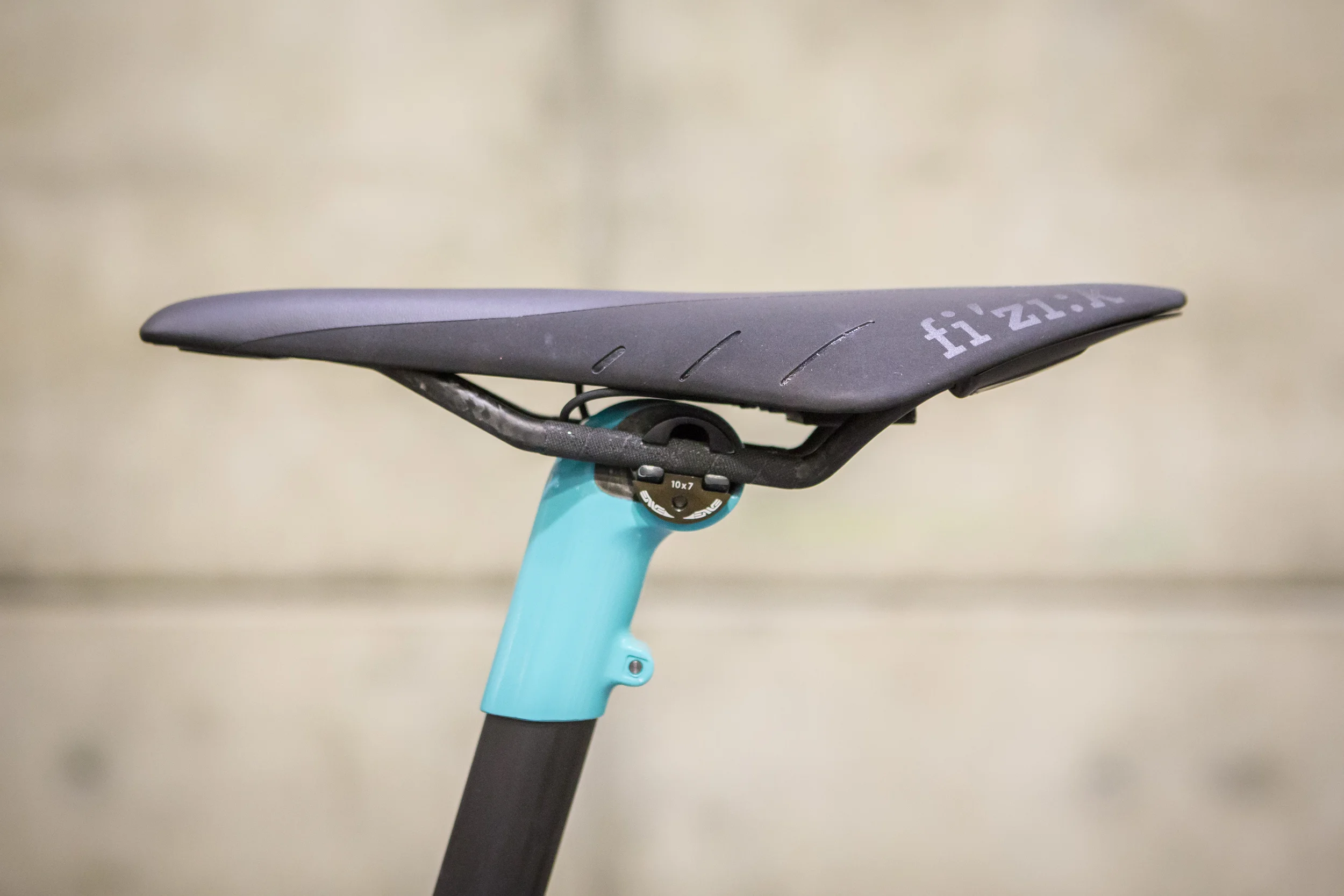 While on the floor shooting I spotted the box under the saddle, an interesting choice and a very clean place to mount it. Glued to the bottom of the saddle, it's out of the way yet perfectly accessible during tuning. We're lucky enough that Di2 so rarely needs adjustment, but when it's needed the Junction A box is there for you but out of the way the rest of the time.